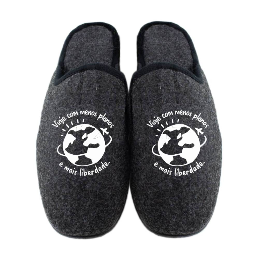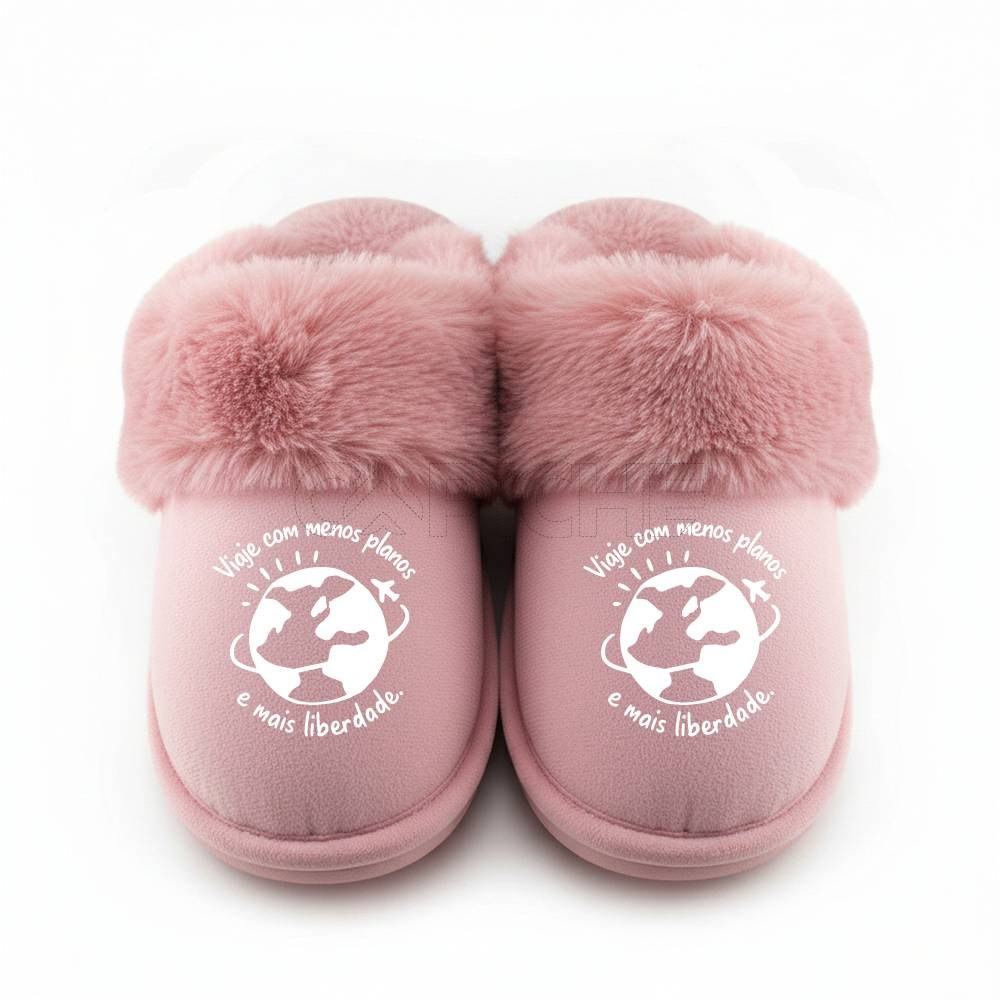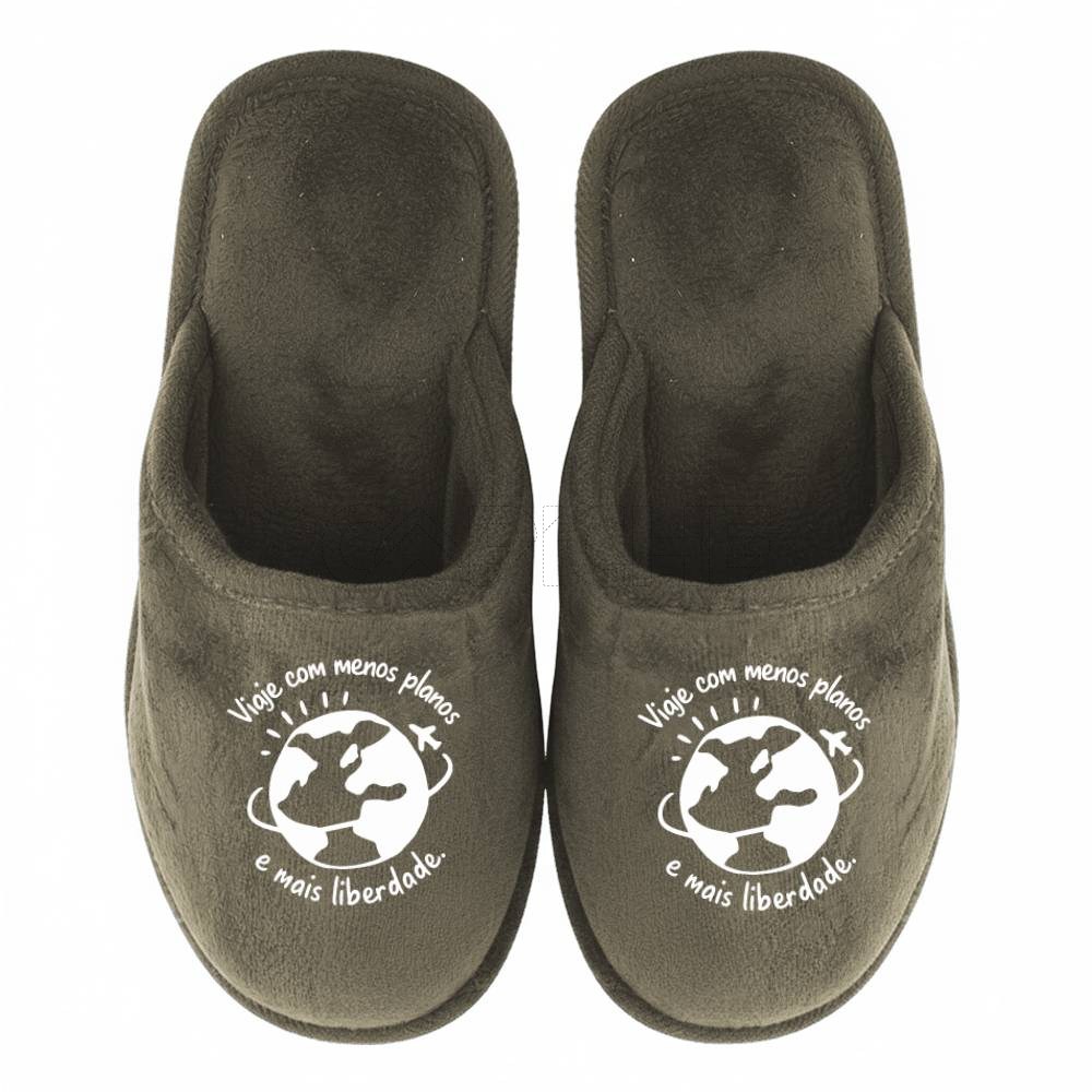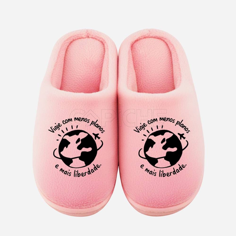 Chinelos com a frase: Viaje com menos planos e mais liberdade