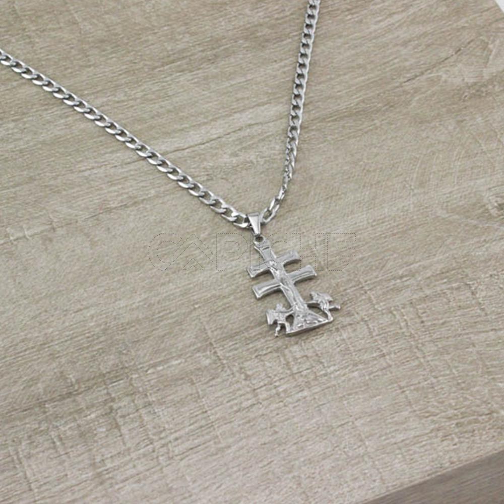 Este colar traz a tradicional cruz de Caravaca, também conhecida como “cruz de dois braços”, associada a bênçãos especiais e à abertura de caminhos.