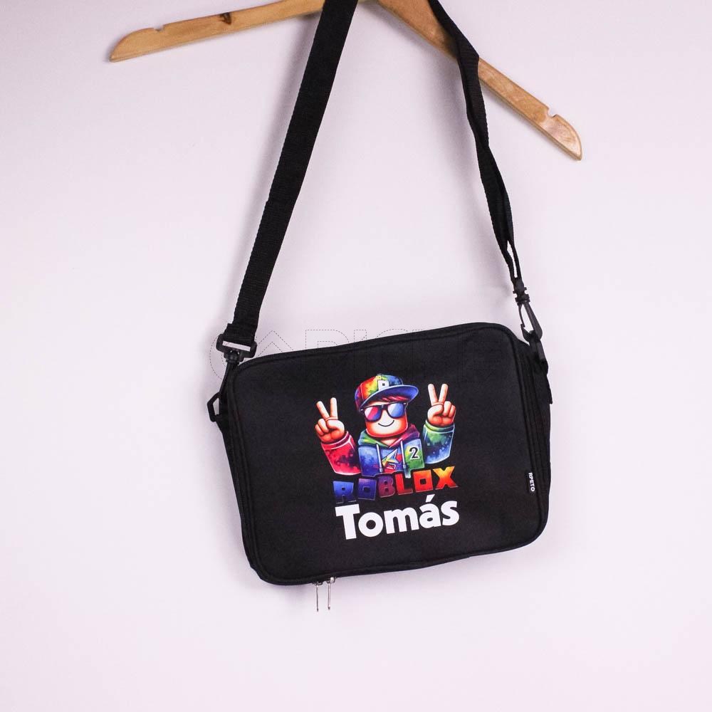 Prática e estilosa, esta lancheira escolar, na cor preta e inspirada no universo Roblox, é personalizada com o nome Tomás, garantindo identificação fácil e um toque único.