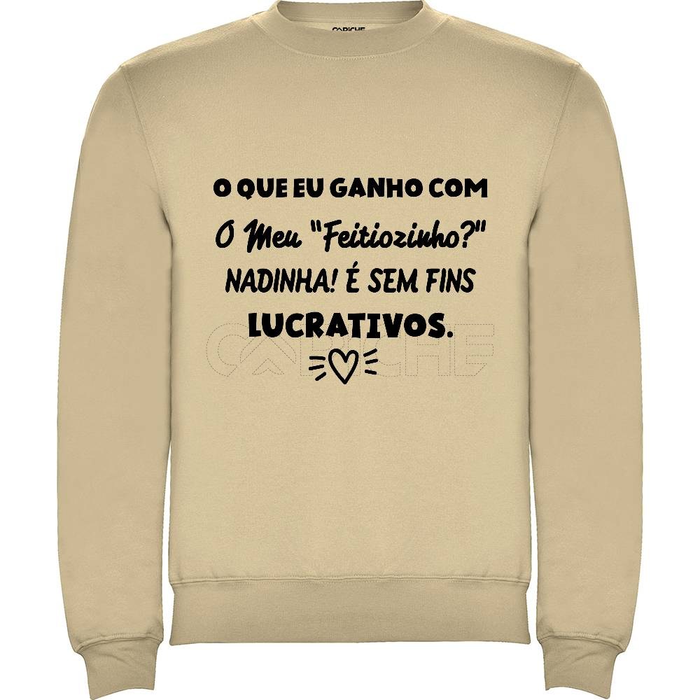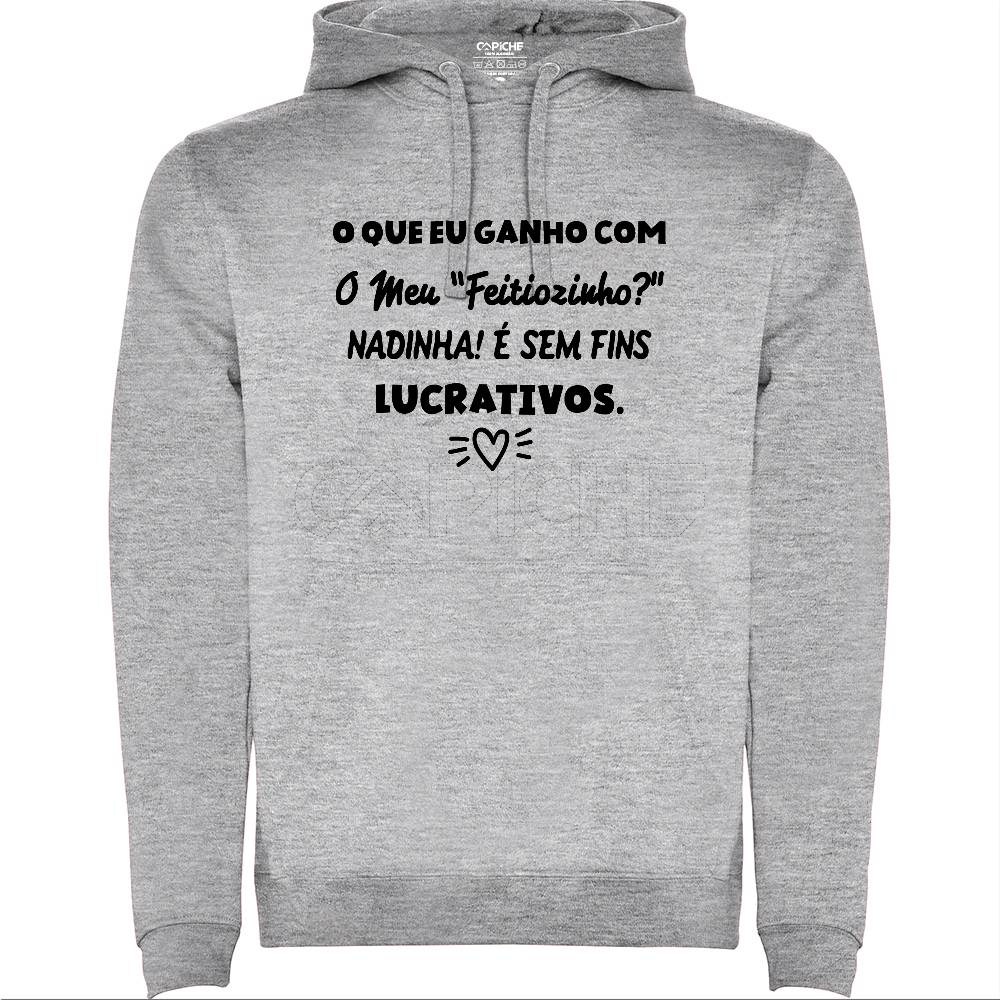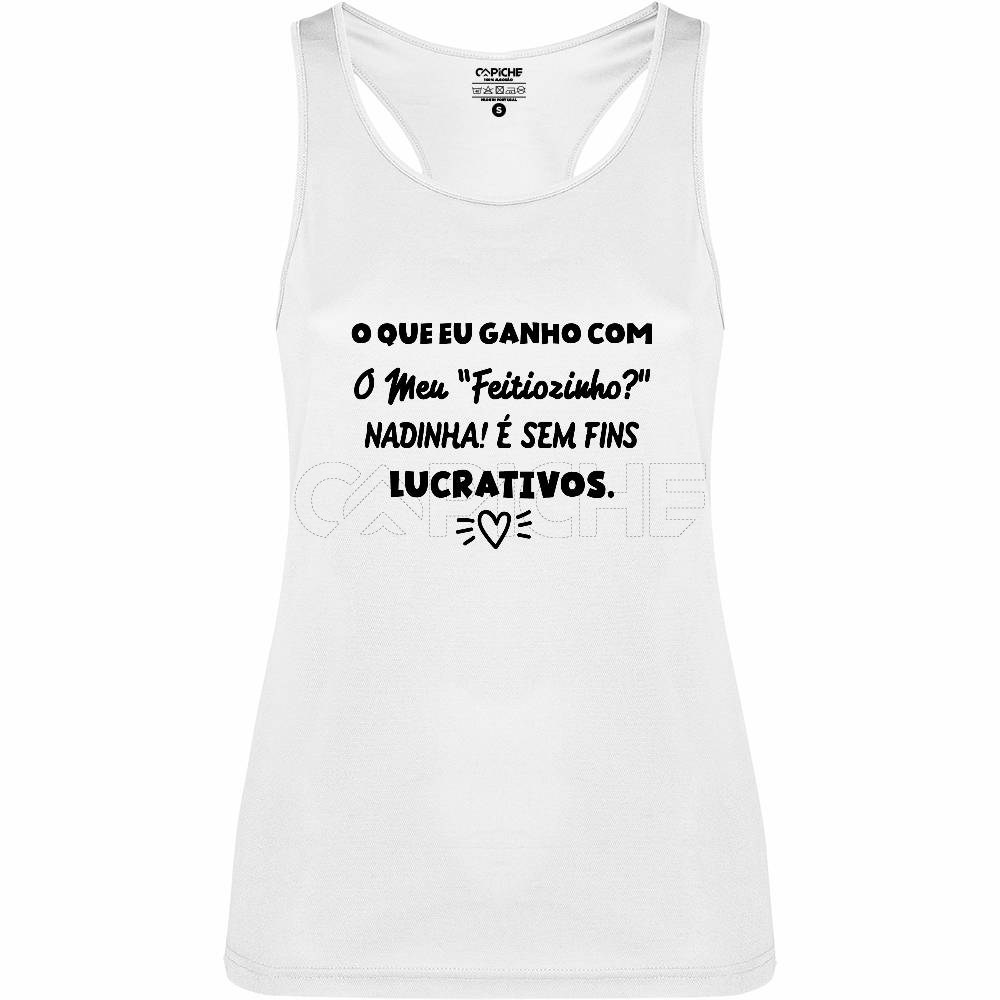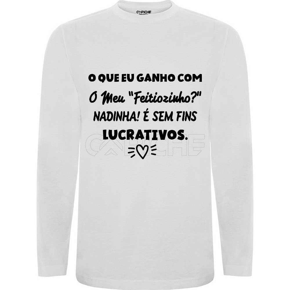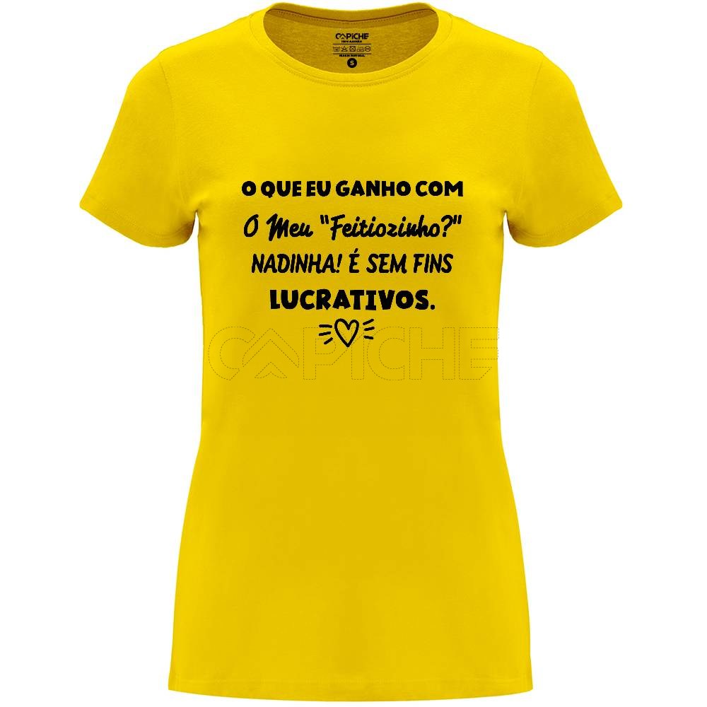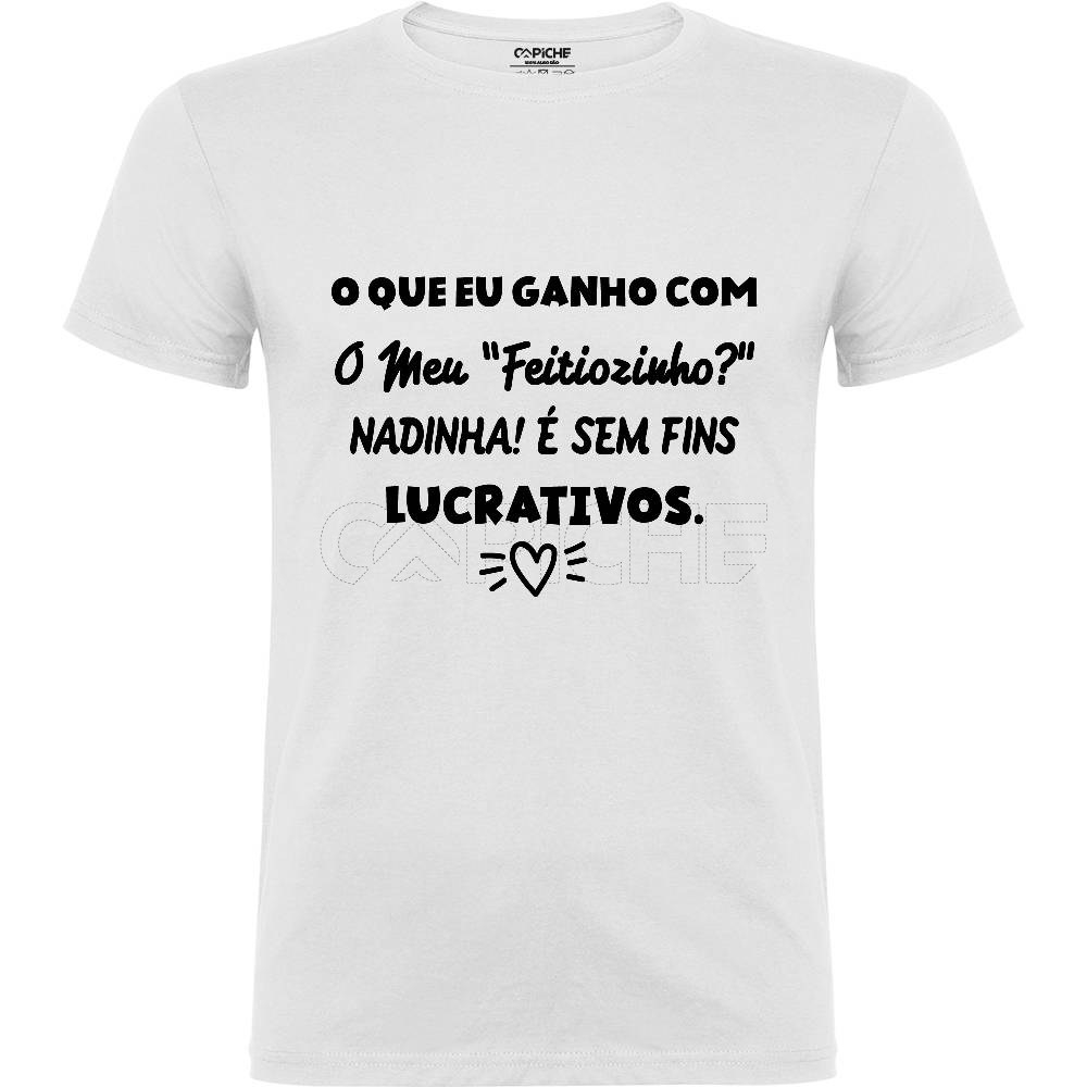 T-shirt com a frase: "O que eu ganho com o meu "feitiozinho?" nadinha! é sem fins lucrativos."